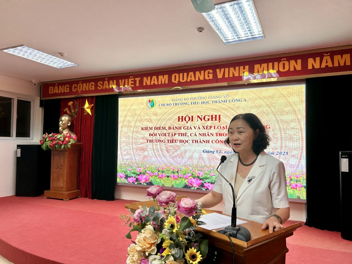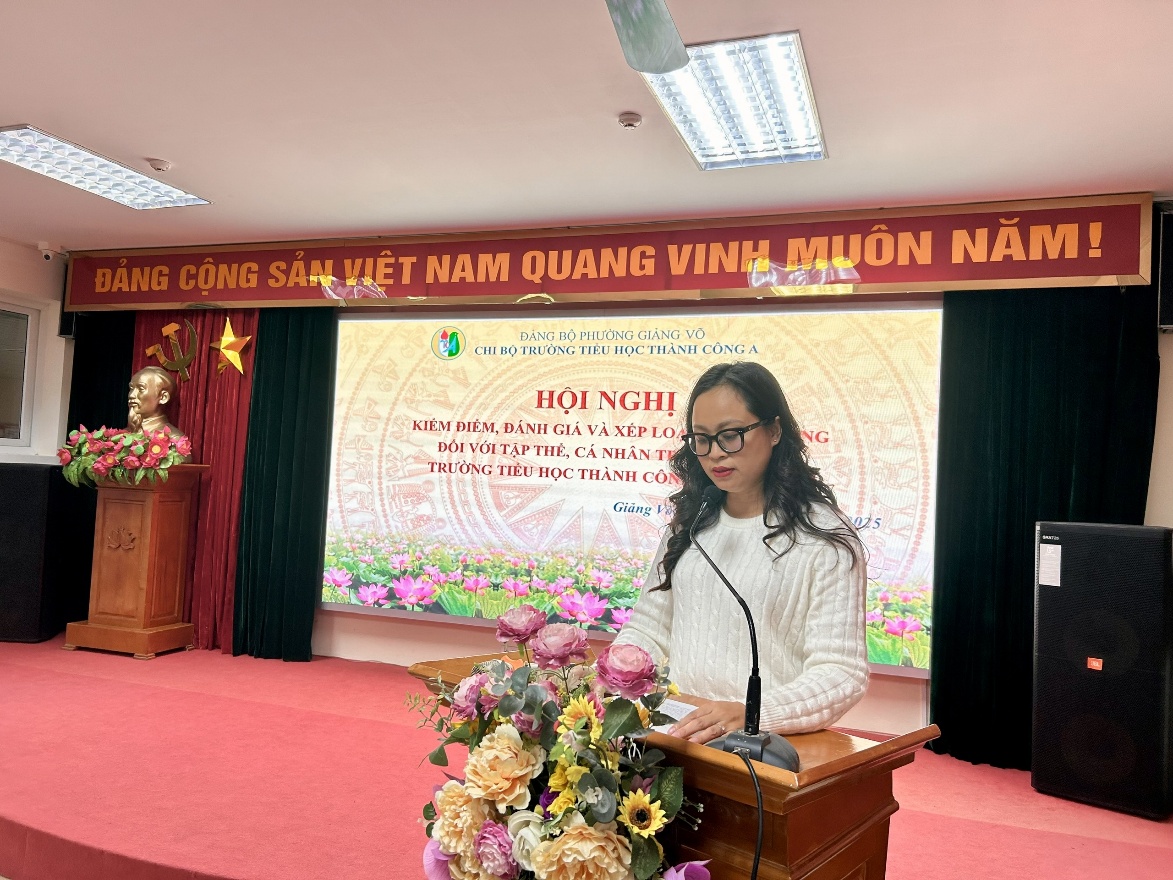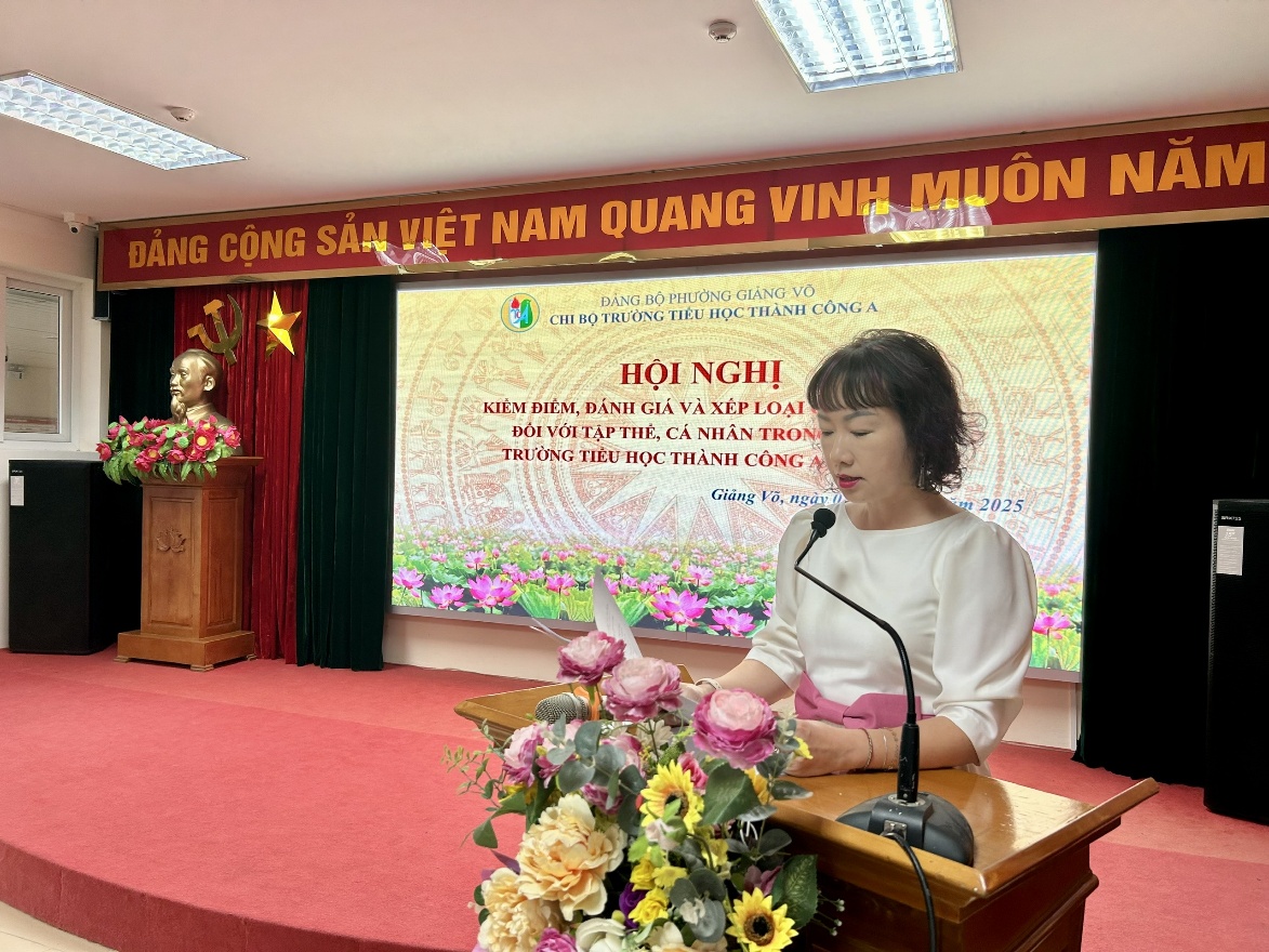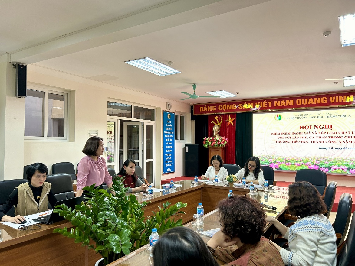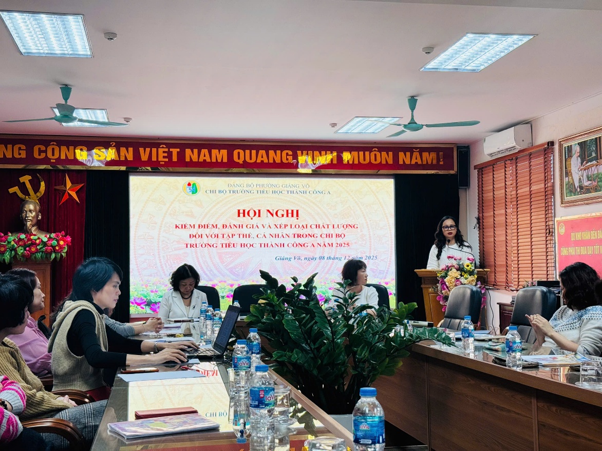 Chiều ngày 8 tháng 12 năm 2025, Chi bộ Trường Tiểu học Thành Công A đã long trọng tổ chức Hội nghị kiểm điểm, đánh giá và xếp loại chất lượng tập thể, cá nhân đảng viên cuối năm 2025. Đây là hoạt động thường niên nhằm nhìn lại kết quả lãnh đạo trong năm, thẳng thắn chỉ ra hạn chế và đề ra phương hướng phấn đấu cho năm tới.