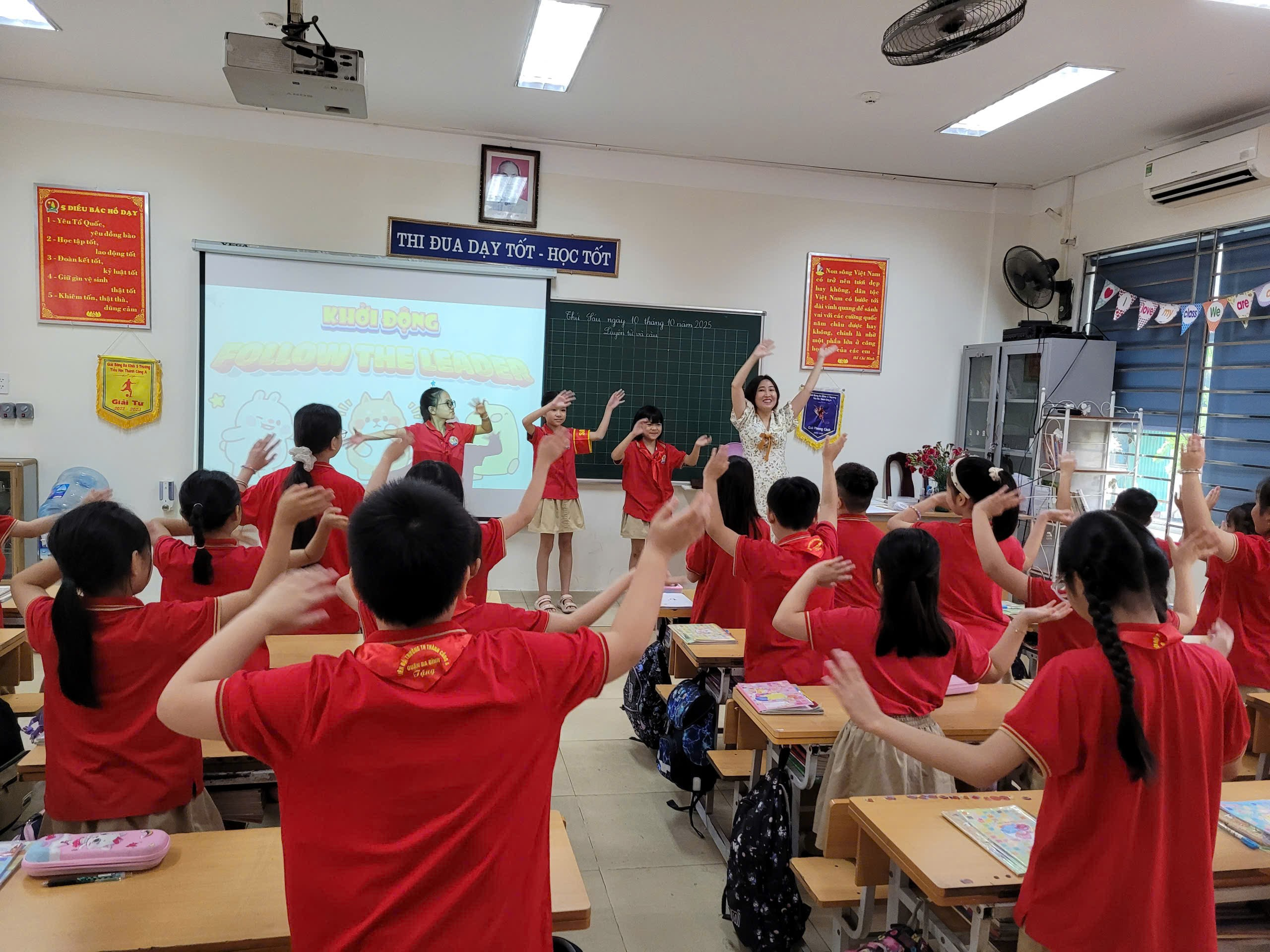 Tiết học bắt đầu bằng trò chơi khởi động “Làm theo người quản trò” sôi nổi và đầy tiếng cười. Các con được lên làm quản trò, tự tin thể hiện các động tác trong khi các bạn bên dưới hào hứng làm theo. Không khí lớp học rộn ràng, vui tươi, tạo tâm thế thoải mái cho các em bước vào bài mới. Đồng thời, cô giáo đã khéo léo lồng ghép kiểm tra kiến thức cũ và gợi mở kiến thức mới một cách tự nhiên và hiệu quả.