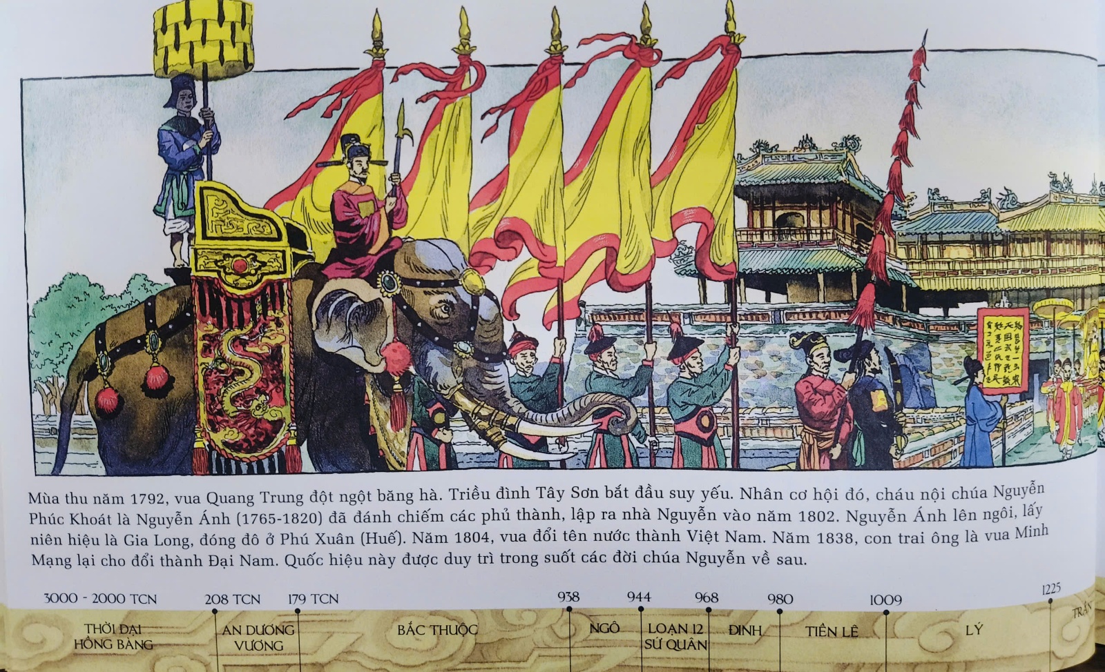 Cùng đọc và xem những bức tranh từ trang 14 đến trang 19, chúng ta sẽ hiểu được điều đó. Cuốn sách còn kể về người anh hùng Đinh Bộ Lĩnh dẹp loạn 12 sứ quân, về sự thăng trầm thay đổi của các triều đại Đinh - Lê - Lí - Trần ... v.v..., về Đảng, về Cách mạng, về những cuộc đấu tranh chống Pháp, chống Mỹ.