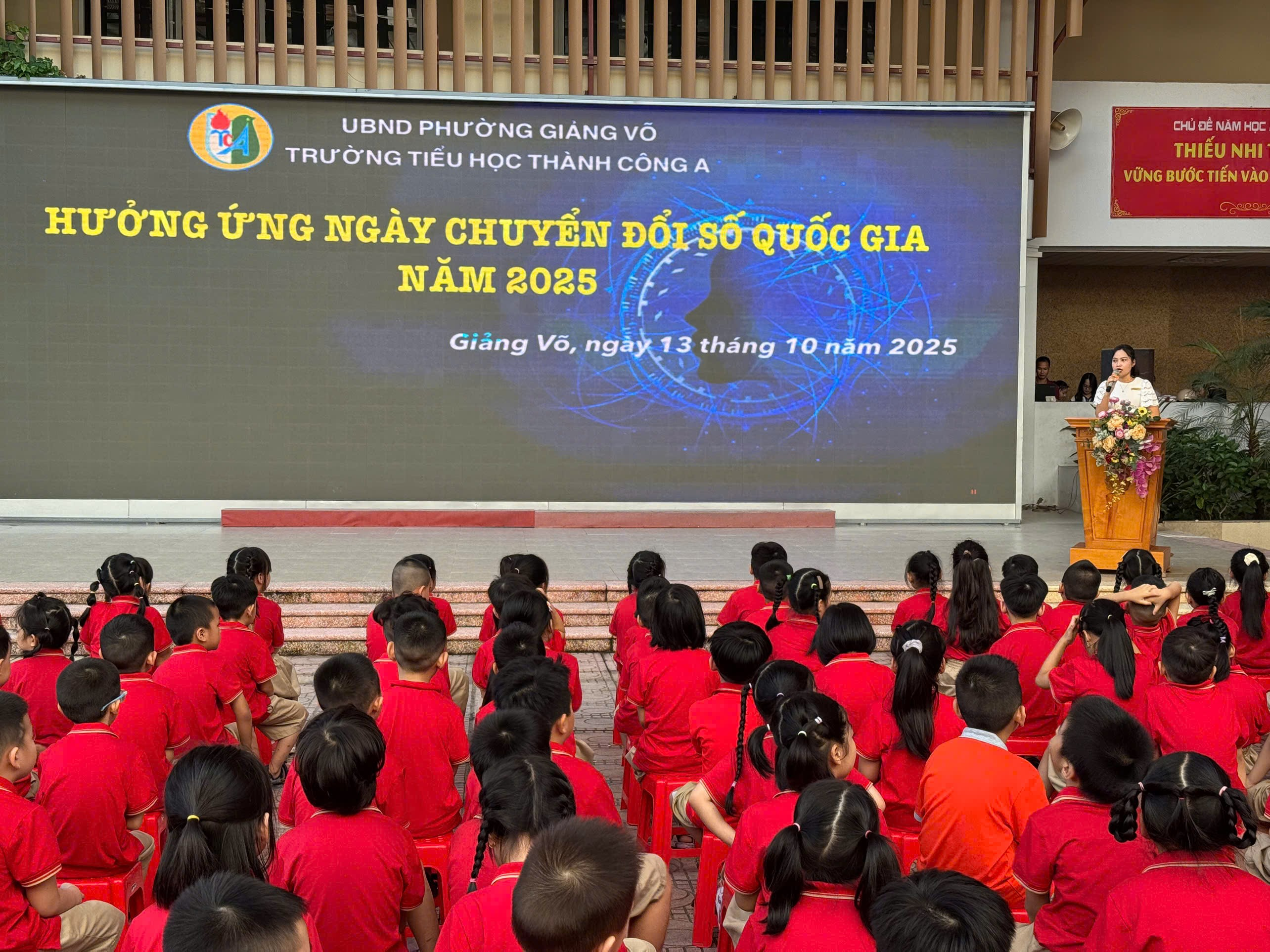 Hưởng ứng Ngày Chuyển đổi số quốc gia (10/10) với chủ đề “Chuyển đổi số: Nhanh hơn, hiệu quả hơn, gần dân hơn”, trường Tiểu học Thành Công A đã tổ chức các hoạt động hưởng ứng Ngày Chuyển đổi số quốc gia năm 2025 nhằm đẩy mạnh truyền thông, lan tỏa tinh thần chuyển đổi số đến toàn thể cán bộ, giáo viên, nhân viên, phụ huynh trong nhà trường.
