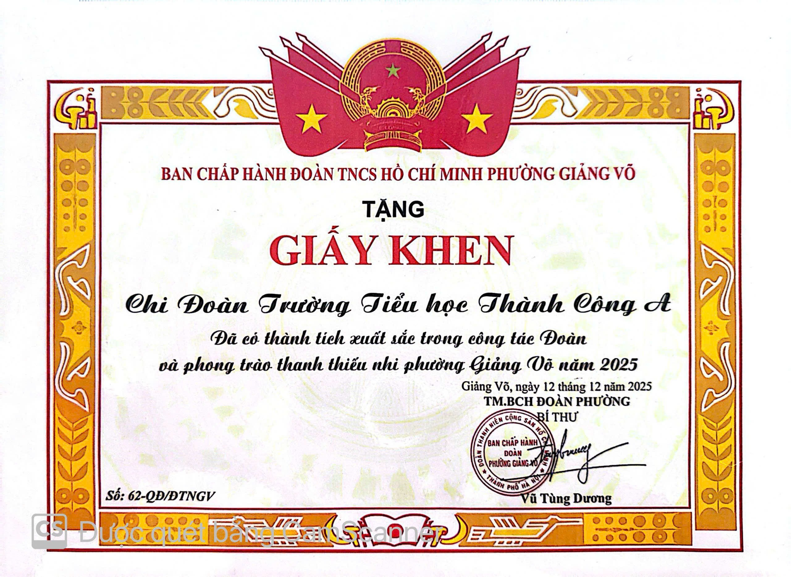 Tại Hội nghị tổng kết công tác Đoàn và phong trào Thanh thiếu nhi phường Giảng Võ năm 2025, Trường Tiểu học Thành Công A vinh dự là một trong những đơn vị được biểu dương, khen thưởng vì đã có thành tích xuất sắc trong công tác và phong trào Thanh thiếu nhi trên địa bàn phường.