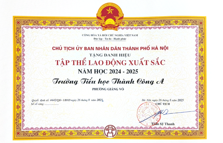 Thực hiện nhiệm vụ năm học 2024 - 2025 với tinh thần đoàn kết, đổi mới và nỗ lực không ngừng, tập thể cán bộ, giáo viên, nhân viên Trường Tiểu học Thành Công A đã hoàn thành Xuất sắc các nhiệm vụ được giao. Với những thành tích nổi bật trong công tác giáo dục và đào tạo, nhà trường vinh dự được Đảng ủy- HĐND- Ủy ban nhân dân phường Giảng Võ tặng danh hiệu “Tập thể Lao động xuất sắc” theo Quyết định số 4442/QĐ-UBND ngày 26/8/2025.