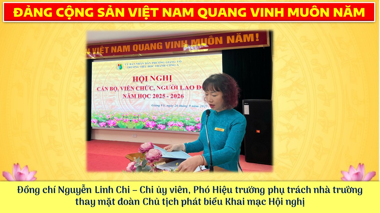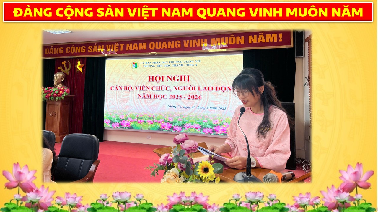 Năm học 2025-2026 là năm học mang nhiều màu sắc mới của trường Tiểu học Thành Công A. Đây là một năm học thực hiện nhiệm vụ giáo dục với tinh thần mới, khí thế mới, một năm học tiếp tục đổi mới toàn diện về công tác quản lý, nâng cao chất lượng giáo dục toàn diện; tiếp tục ứng dụng công nghệ thông tin, đẩy mạnh chuyển đổi số vào công tác giảng dạy và giáo dục học sinh, đặc biệt hướng tới xây dựng trường học hạnh phúc - là nơi cả giáo viên và học sinh thực sự được an toàn, được yêu thương và được tôn trọng.