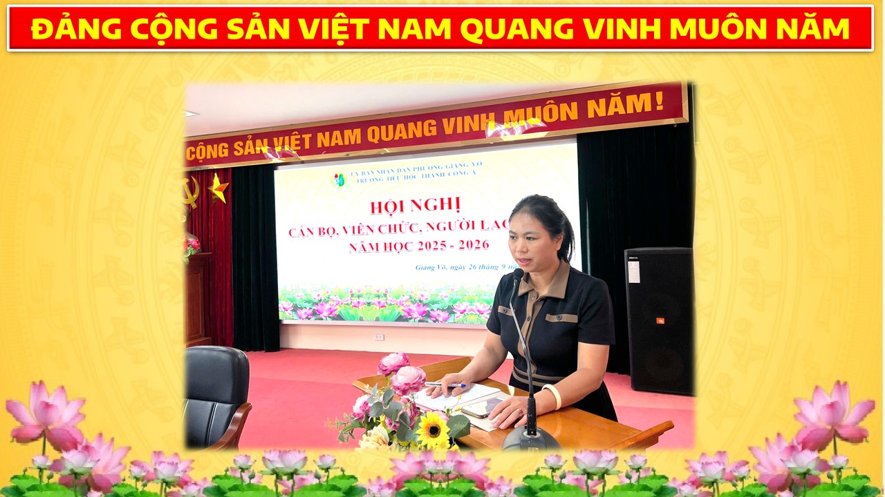 Ngày 26/9/2025, trường Tiểu học Thành Công A tổ chức Hội nghị cán bộ, viên chức và người lao động năm học 2025 - 2026. Đây là một trong những hoạt động có ý nghĩa quan trọng để nhà trường tổng kết, đánh giá lại kết quả năm học 2024 - 2025 và đề ra phương hướng cho năm học mới 2025 – 2026, vững vàng hướng tới mục tiêu xây dựng trường học hạnh phúc.