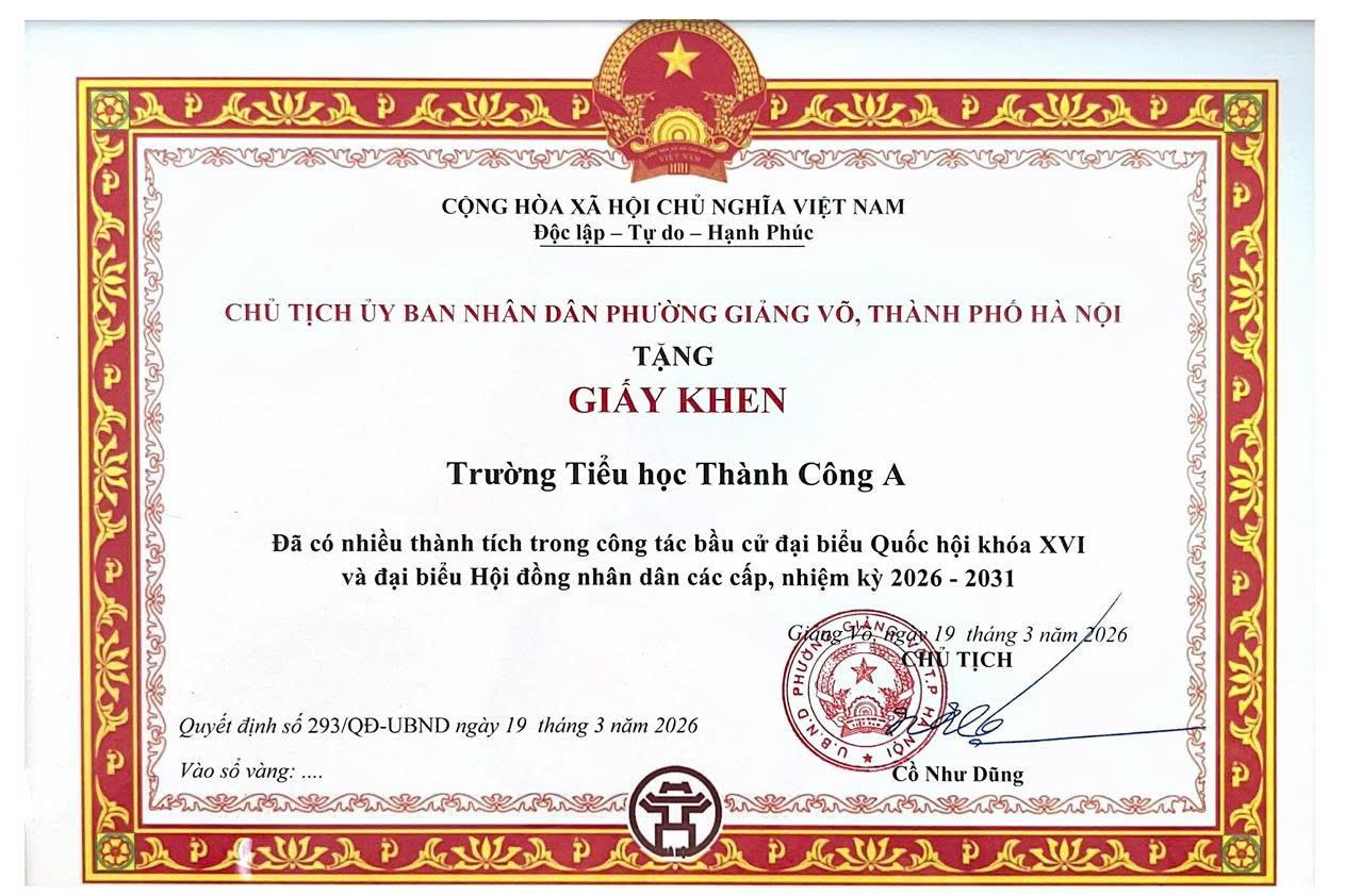 Trường Tiểu học Thành Công A được khen thưởng trong công tác phục vụ bầu cử Quốc hội khóa XVI và đại biểu Hội đồng nhân dân các cấp, nhiệm kỳ 2026 - 2031