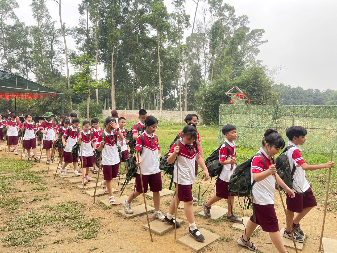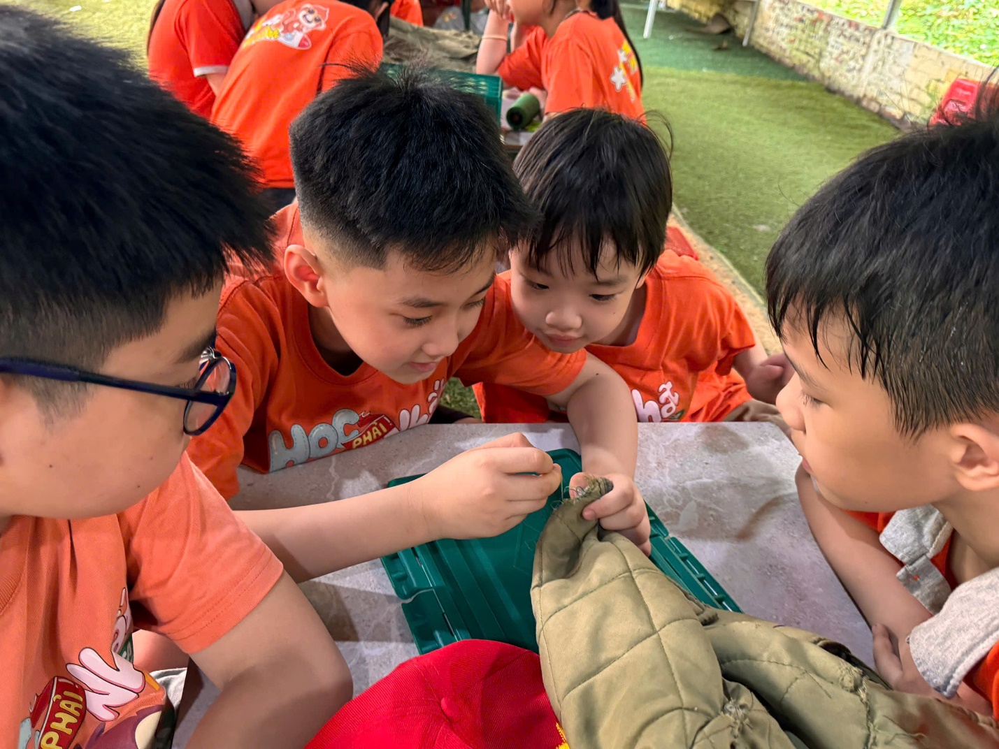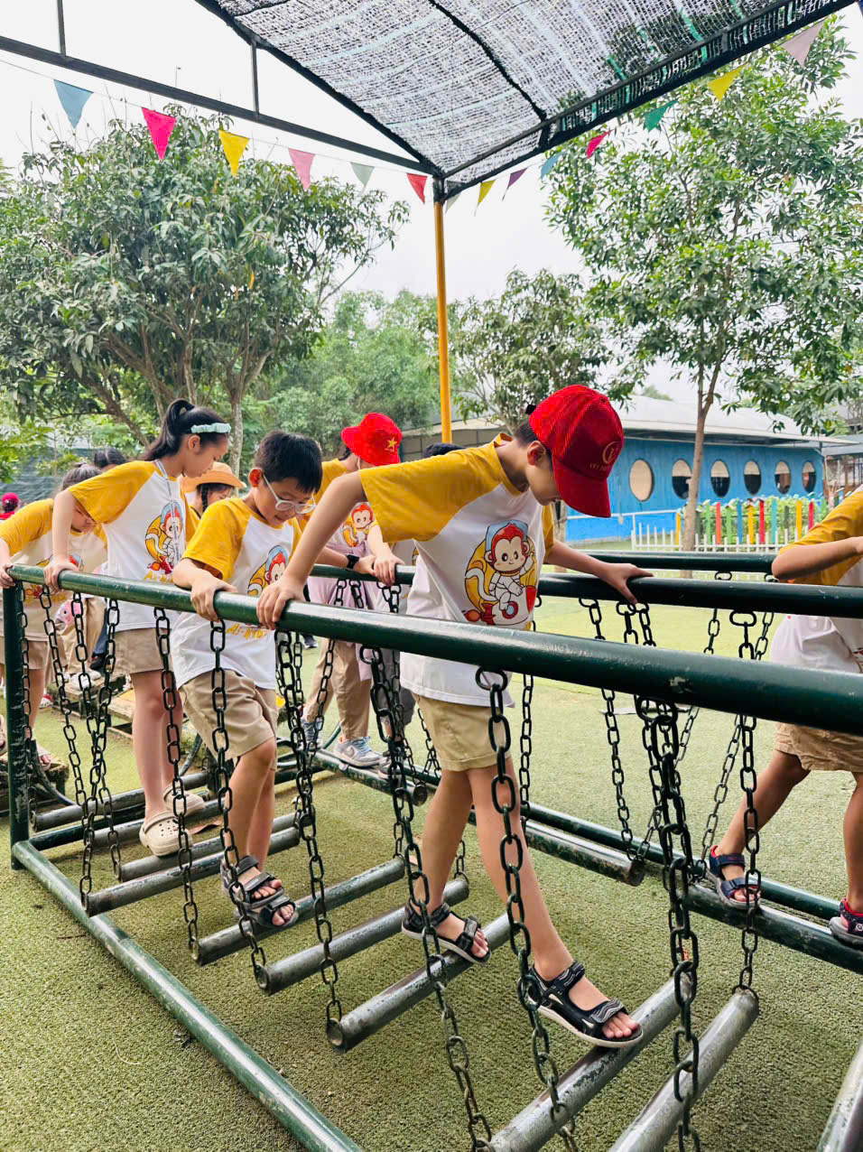 Trên thao trường nắng gió, tinh thần đồng đội của các con chưa bao giờ rực cháy đến thế. Các con đã cùng nhau vượt qua chuỗi thử thách vận động liên hoàn, từ nhảy dù, vượt rào lưới thép đến đu xà kép. Những bàn tay nhỏ nắm chặt lấy nhau, những lời cổ vũ "Cố lên, bạn ơi!" vang lên không ngớt dọc theo đường trượt Zipline quân sự. Hạnh phúc nhất có lẽ là lúc cả nhóm cùng chung sức đẩy chiếc xe thồ vận lương hay cùng nhau tìm hiểu về bếp Hoàng Cầm không khói. Trong tiếng cười rộn rã, các con không chỉ thấu hiểu sự vất vả của các chú bộ đội mà còn nhận ra rằng: khi chúng mình cùng nhau, không thử thách nào là không thể vượt qua.