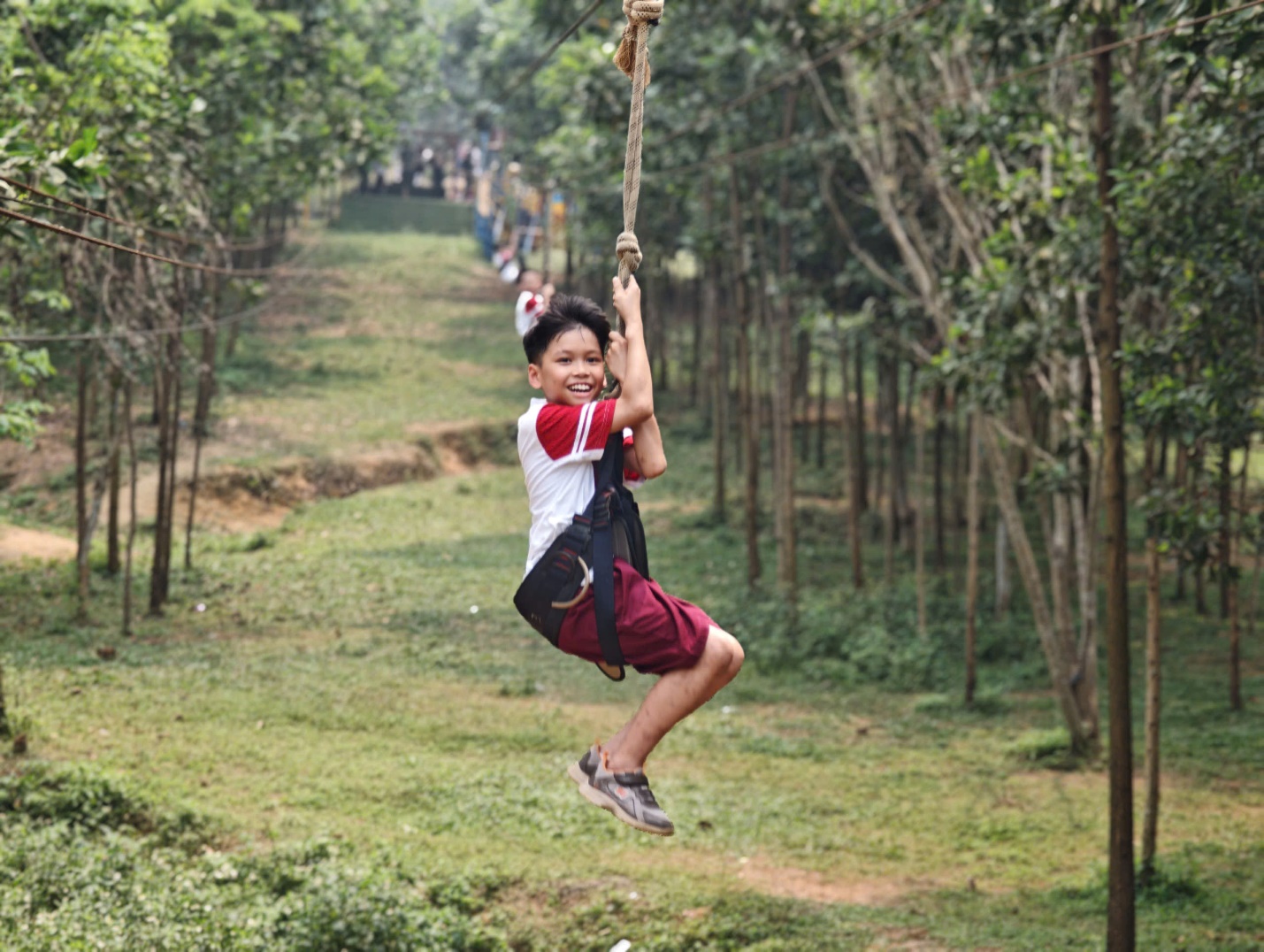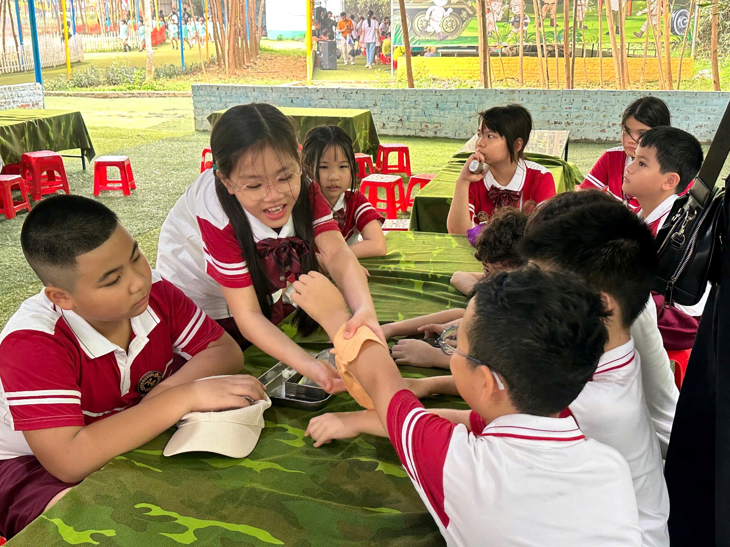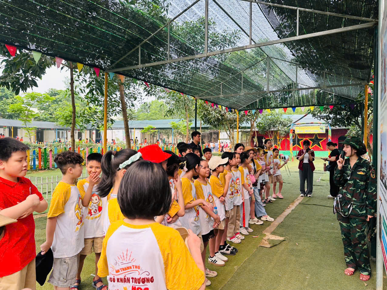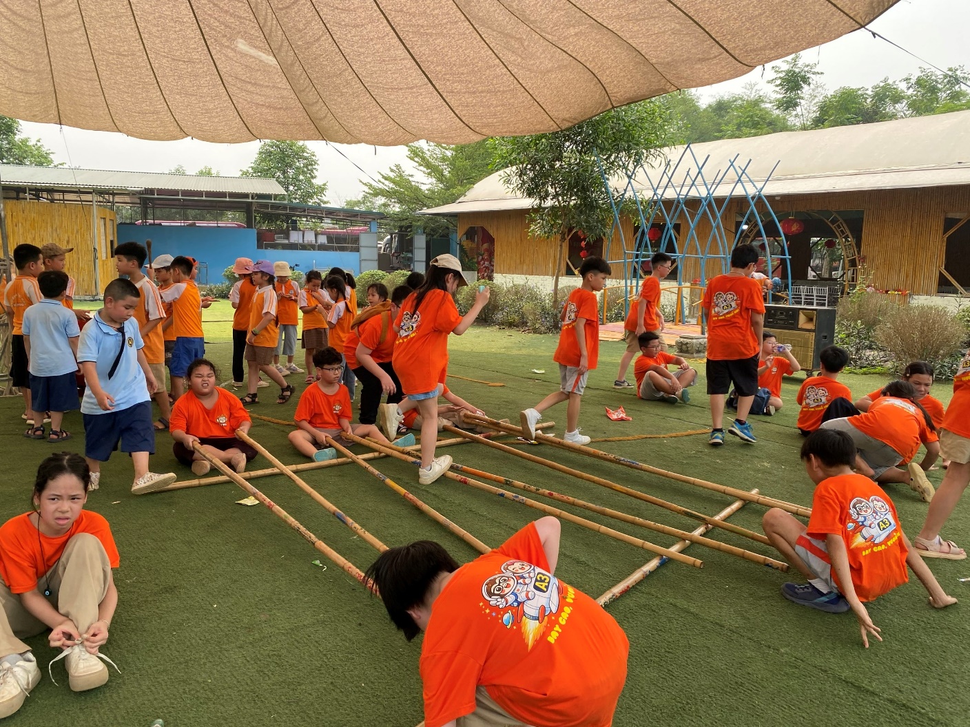 Trên thao trường nắng gió, tinh thần đồng đội của các con chưa bao giờ rực cháy đến thế. Các con đã cùng nhau vượt qua chuỗi thử thách vận động liên hoàn, từ nhảy dù, vượt rào lưới thép đến đu xà kép. Những bàn tay nhỏ nắm chặt lấy nhau, những lời cổ vũ "Cố lên, bạn ơi!" vang lên không ngớt dọc theo đường trượt Zipline quân sự. Hạnh phúc nhất có lẽ là lúc cả nhóm cùng chung sức đẩy chiếc xe thồ vận lương hay cùng nhau tìm hiểu về bếp Hoàng Cầm không khói. Trong tiếng cười rộn rã, các con không chỉ thấu hiểu sự vất vả của các chú bộ đội mà còn nhận ra rằng: khi chúng mình cùng nhau, không thử thách nào là không thể vượt qua.