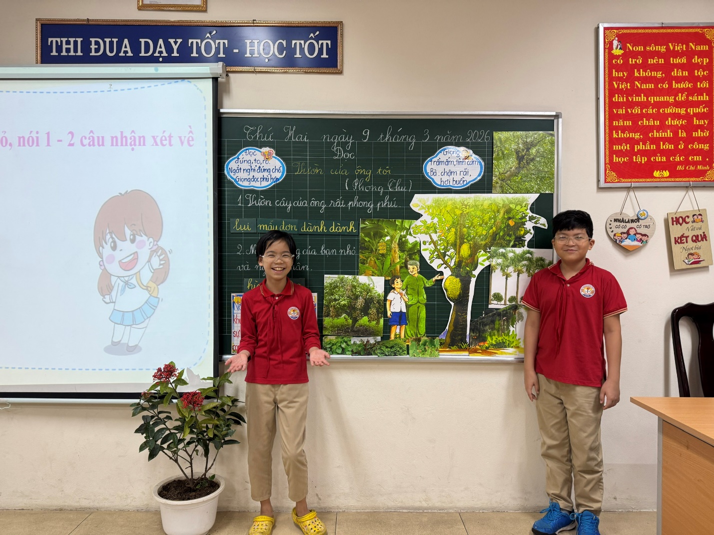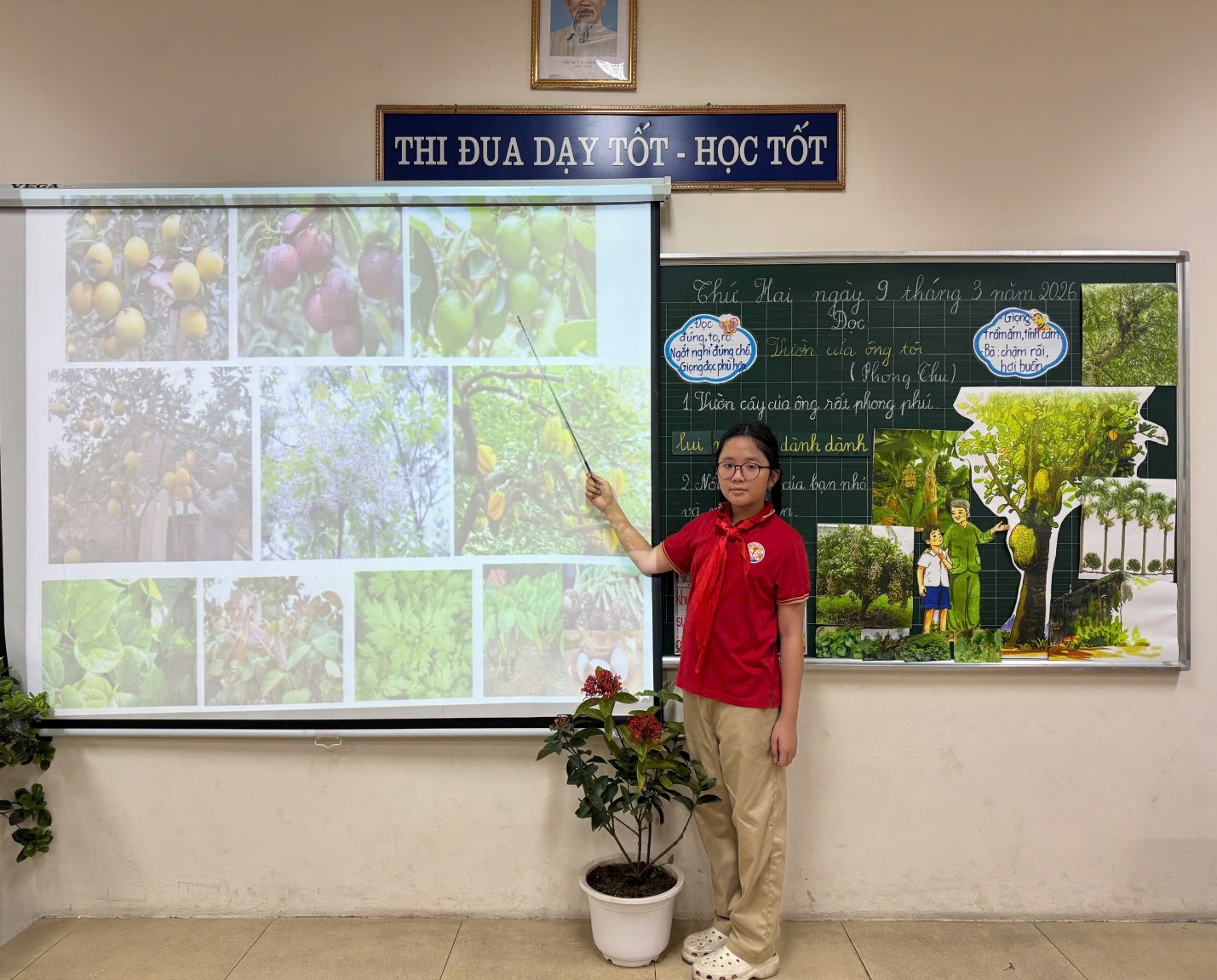 Không dừng lại ở việc hỗ trợ đọc, cô giáo còn khéo léo hướng dẫn học sinh khám phá nội dung bài học một cách nhẹ nhàng mà sâu sắc. Qua từng câu hỏi gợi mở, học sinh dần nhận ra vẻ đẹp phong phú của khu vườn, đồng thời cảm nhận được tình yêu thương, sự tần tảo của người ông dành cho con cháu. Những giá trị nhân văn như lòng biết ơn, sự trân trọng quá khứ được truyền tải một cách tự nhiên, thấm thía.
