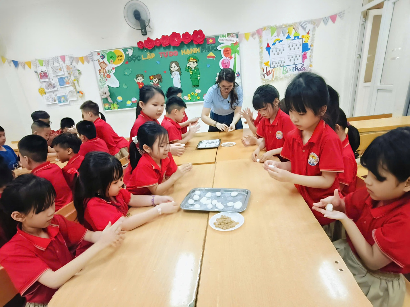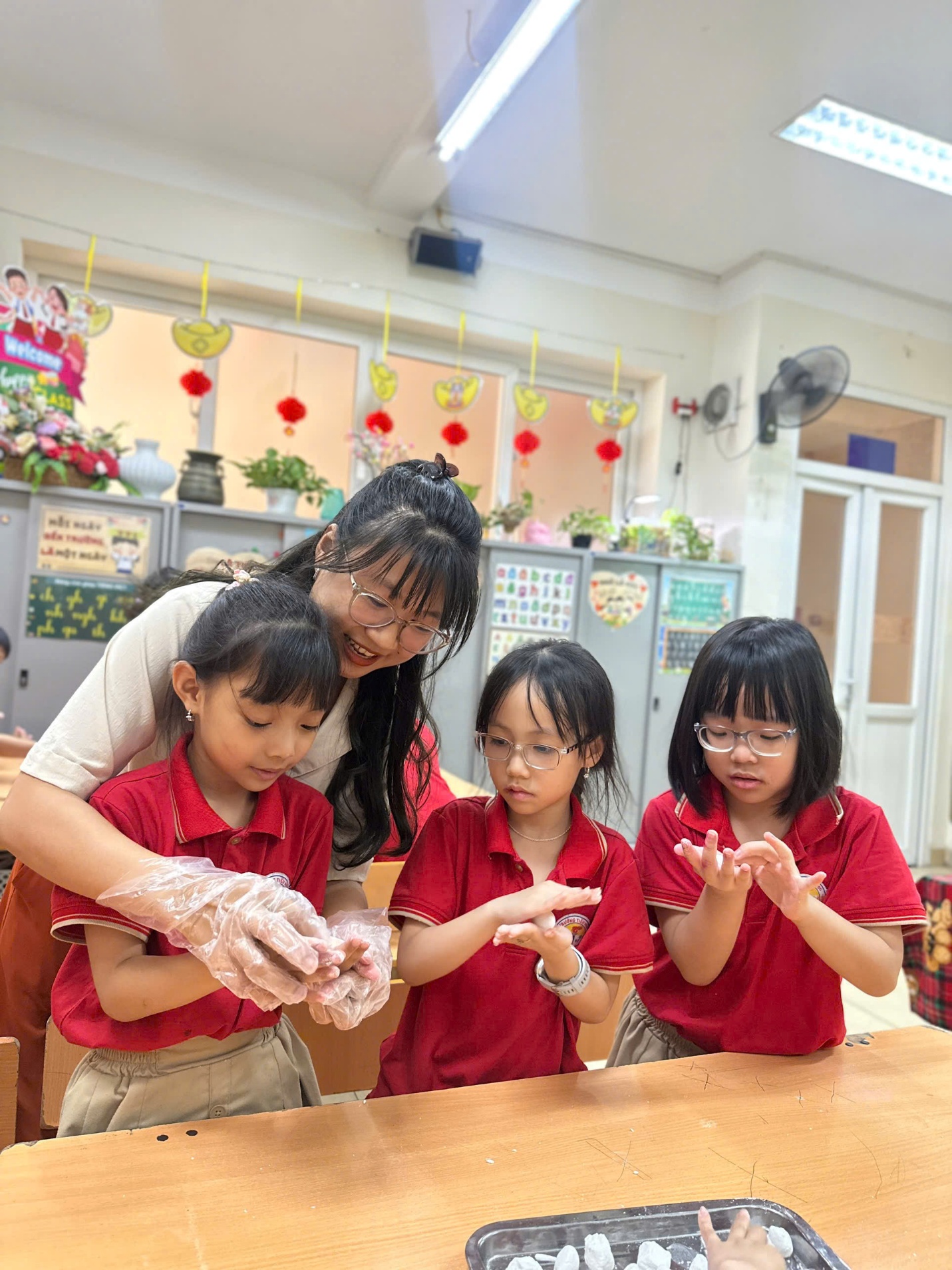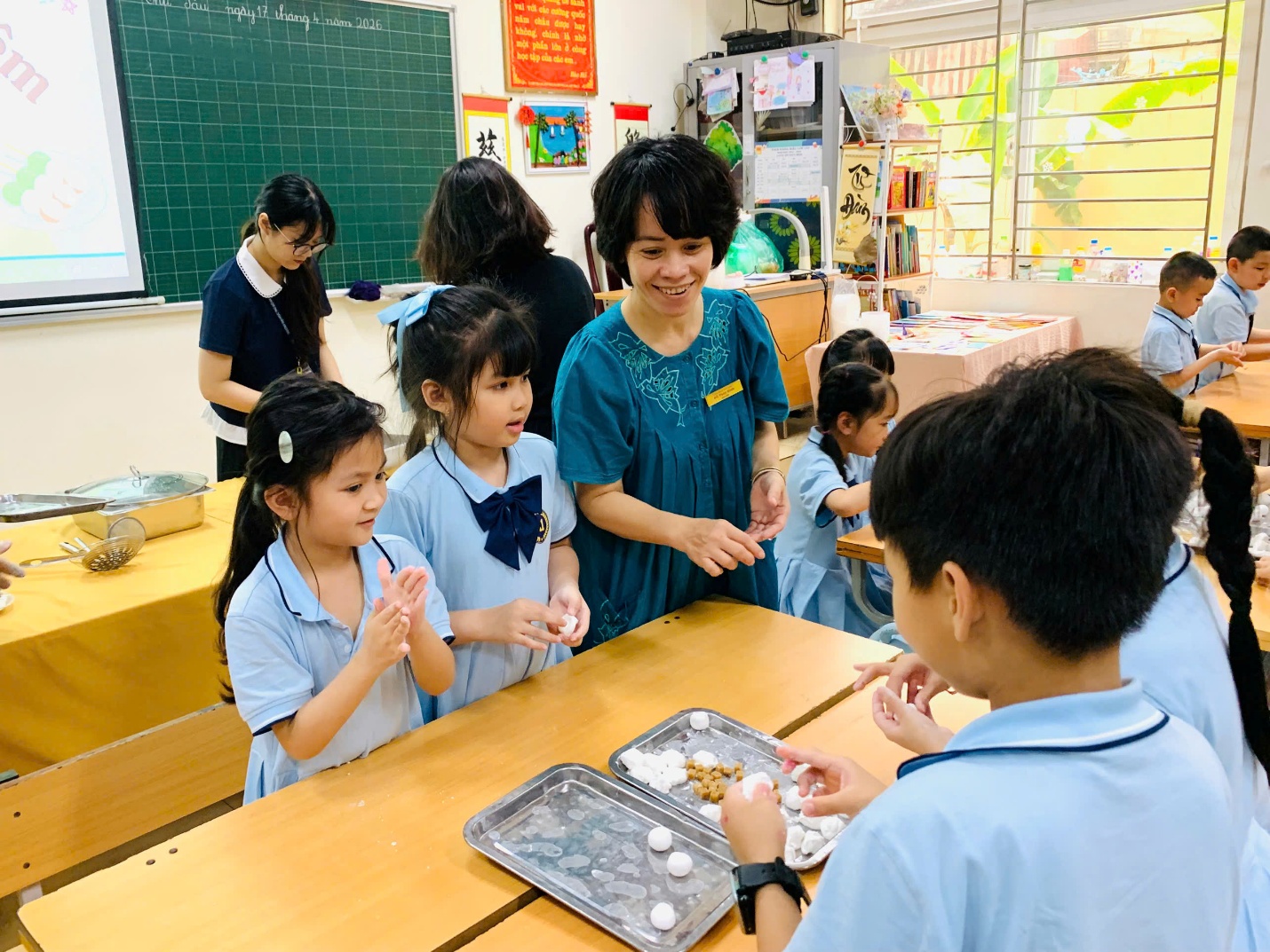 Cô Kiều Trang cùng các con học sinh lớp 1A4 vui nặn bánh trôi.