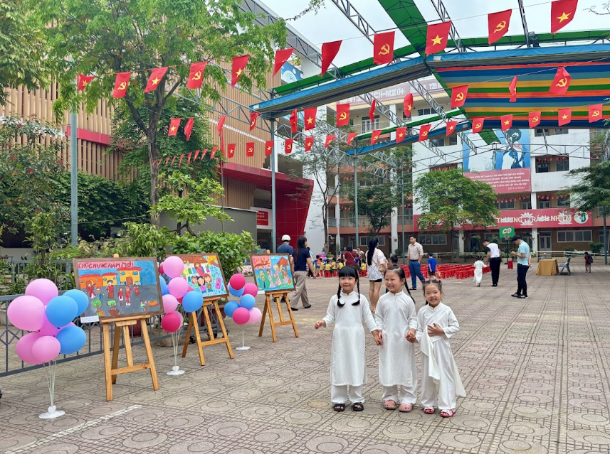 Không khí đón tiếp rộn ràng, thân thiện ngay từ cổng trường