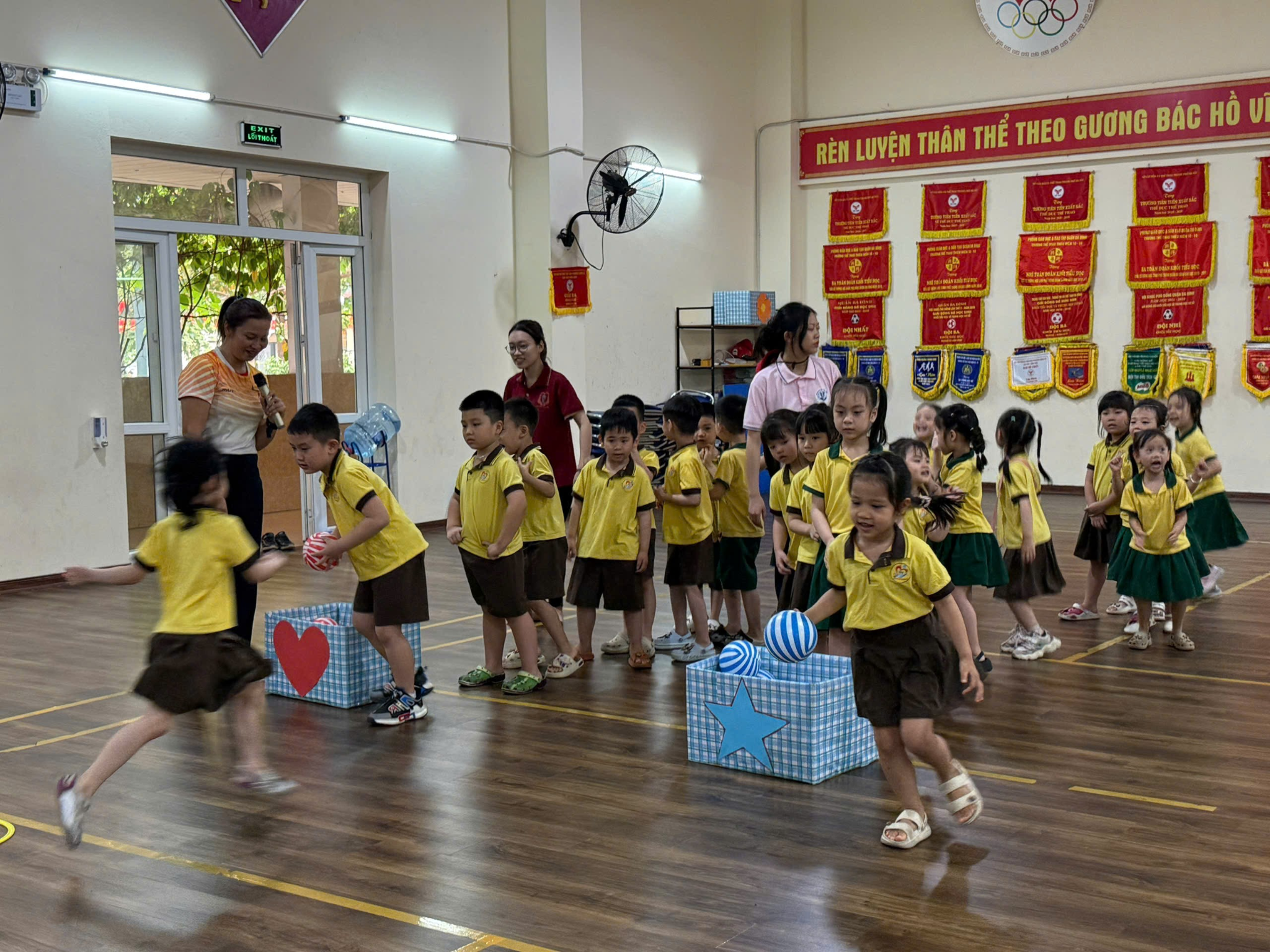Hoạt động trò chơi tập thể sôi động, thu hút sự tham gia nhiệt tình của các bé.