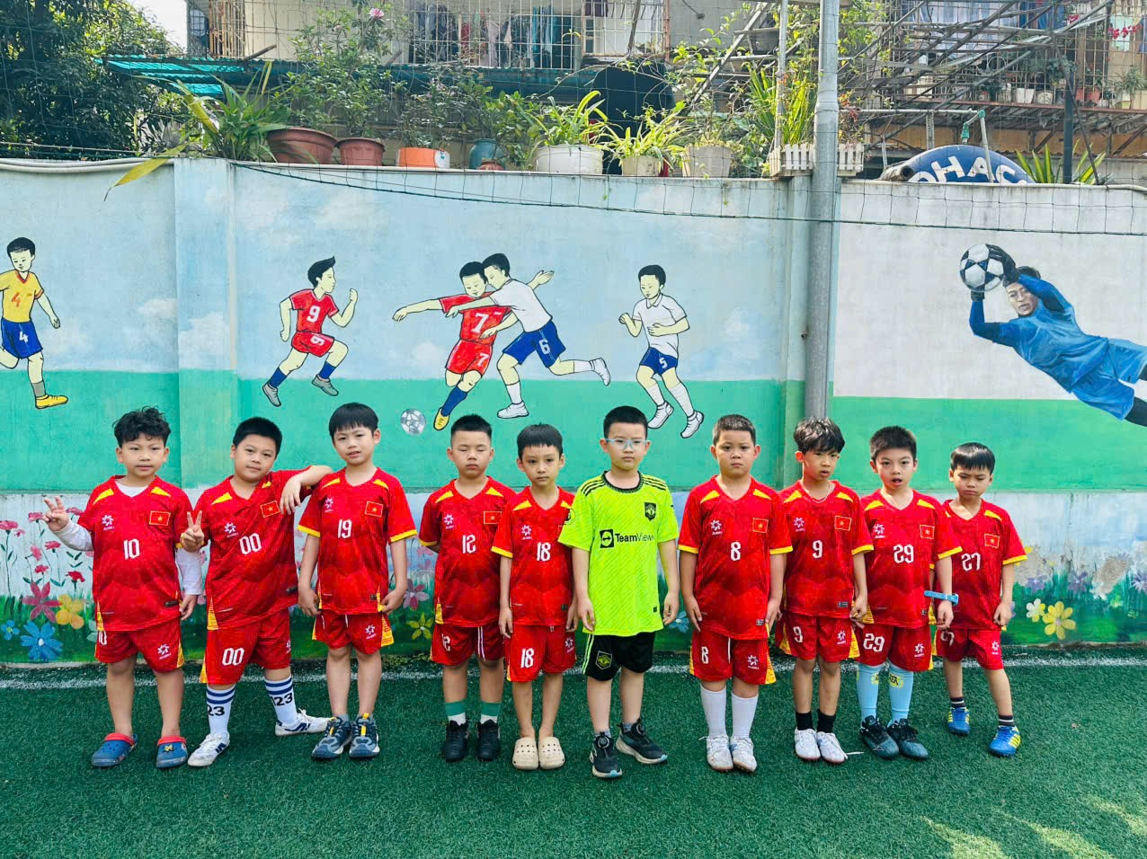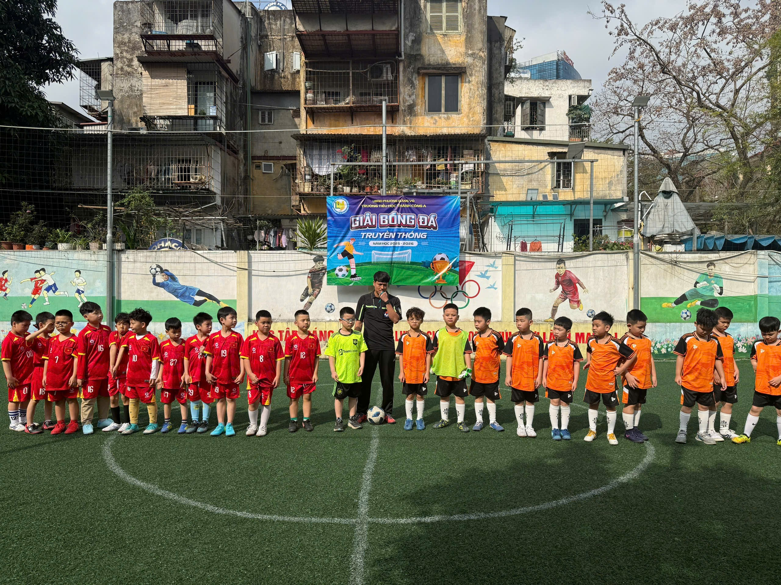 Các cầu thủ nhí lớp 2A1 (bên trái) và các cầu thủ nhí lớp 2A2 (bên phải)