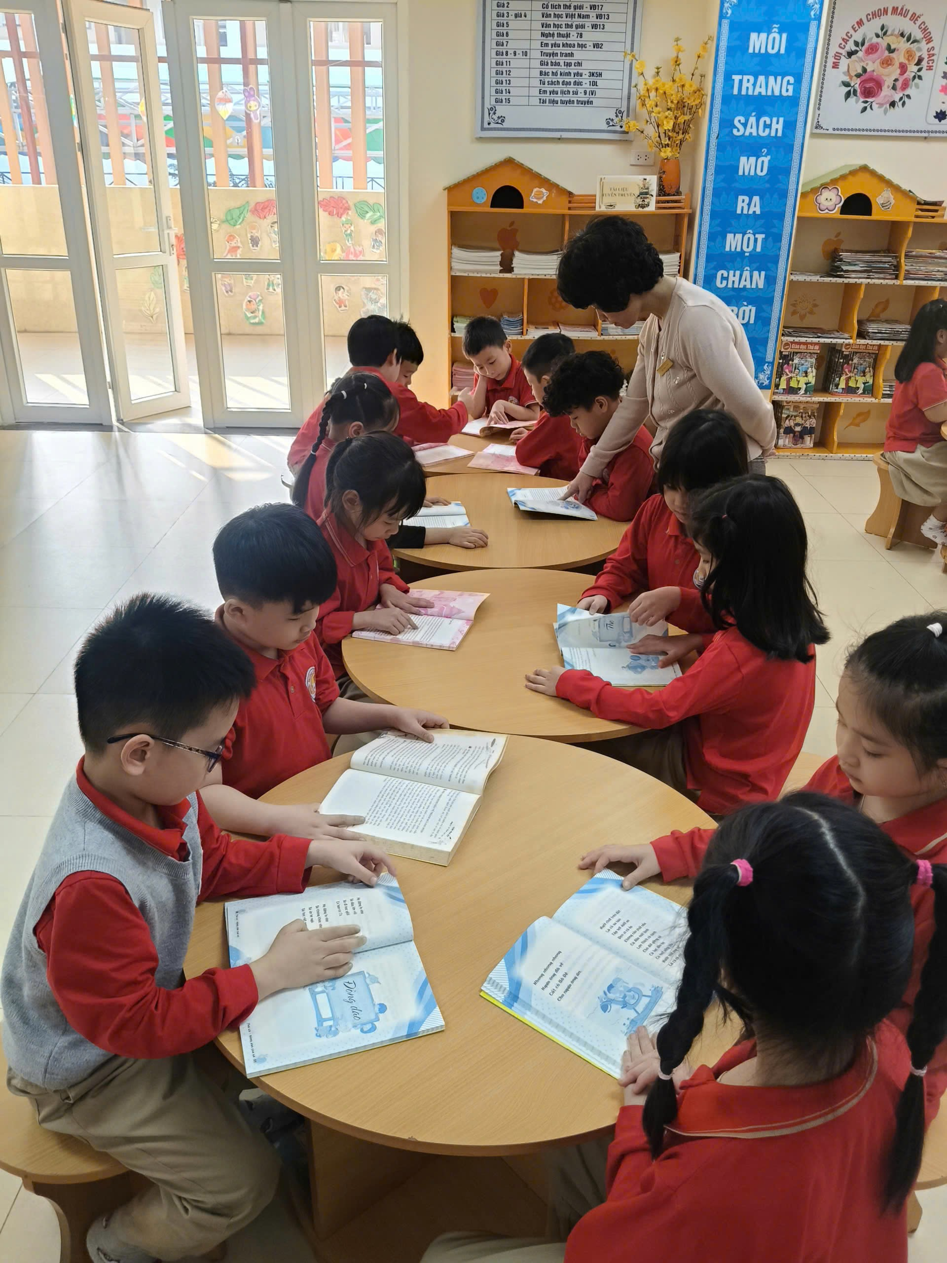 Các tiết học được tổ chức theo từng chủ đề gắn liền với chương trình học chính khóa, giúp học sinh tiếp cận kiến thức theo cách dễ hiểu, gắn kết hơn với thực tế cuộc sống. Đội ngũ giáo viên chủ nhiệm lớp 1 phối hợp chặt chẽ với cán bộ thư viện để xác định các chủ đề học tập phù hợp với chương trình giáo dục hiện hành và đặc điểm tâm lý lứa tuổi của học sinh. Các chủ đề thường xoay quanh những nội dung gần gũi, dễ liên hệ với cuộc sống hằng ngày của các em. Mỗi chủ đề được lựa chọn kỹ lưỡng để phù hợp với trình độ đọc hiểu của học sinh lớp 1, giúp các em dễ dàng tiếp thu và cảm thấy tự tin khi khám phá tri thức.