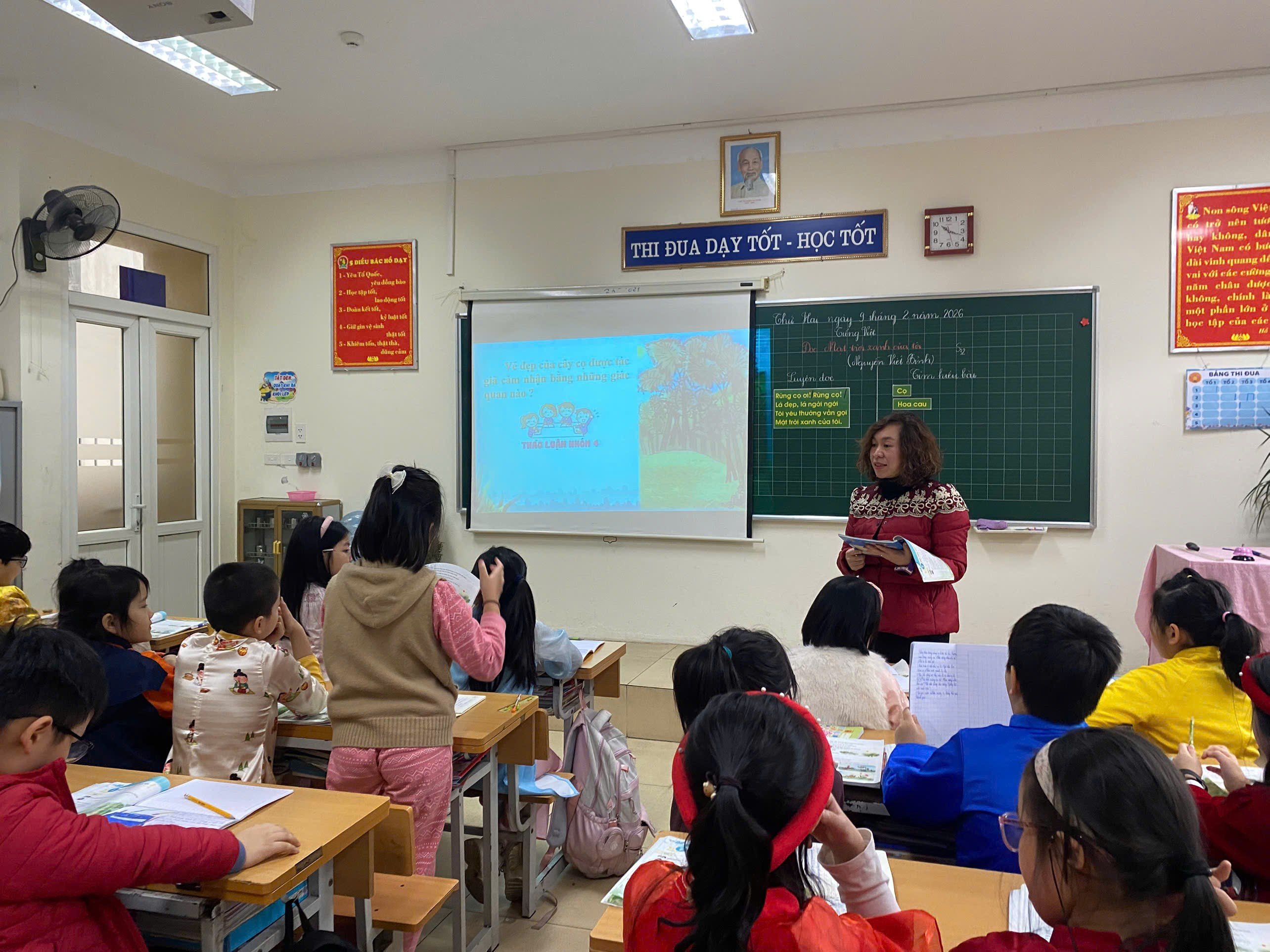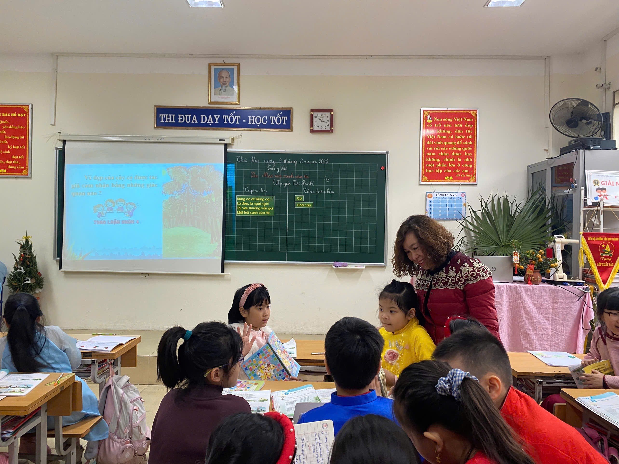 Mở đầu là tiết Tập đọc “Mặt trời xanh của tôi” do cô giáo Đoàn Cẩm Vân – giáo viên chủ nhiệm lớp 3A4 thực hiện. Với giọng đọc truyền cảm cùng cách dẫn dắt nhẹ nhàng, cô đã đưa học sinh bước vào thế giới cảm xúc trong trẻo, giàu hình ảnh của bài đọc. Các hoạt động được tổ chức linh hoạt, khuyến khích học sinh khám phá nội dung, bộc lộ suy nghĩ và cảm nhận của bản thân. Từng ánh mắt chăm chú, từng cánh tay giơ cao phát biểu đã làm nên một tiết học ấm áp, nơi tình yêu thiên nhiên và cảm xúc đẹp được nuôi dưỡng một cách tự nhiên.