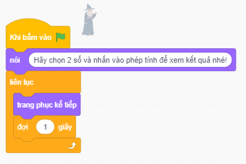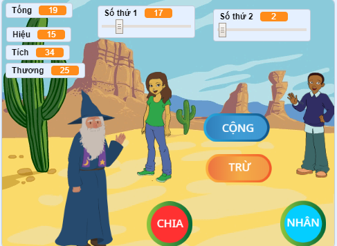 Các đối tượng: Thầy phù thủy, các nút lệnh cộng, trừ, nhân, chia